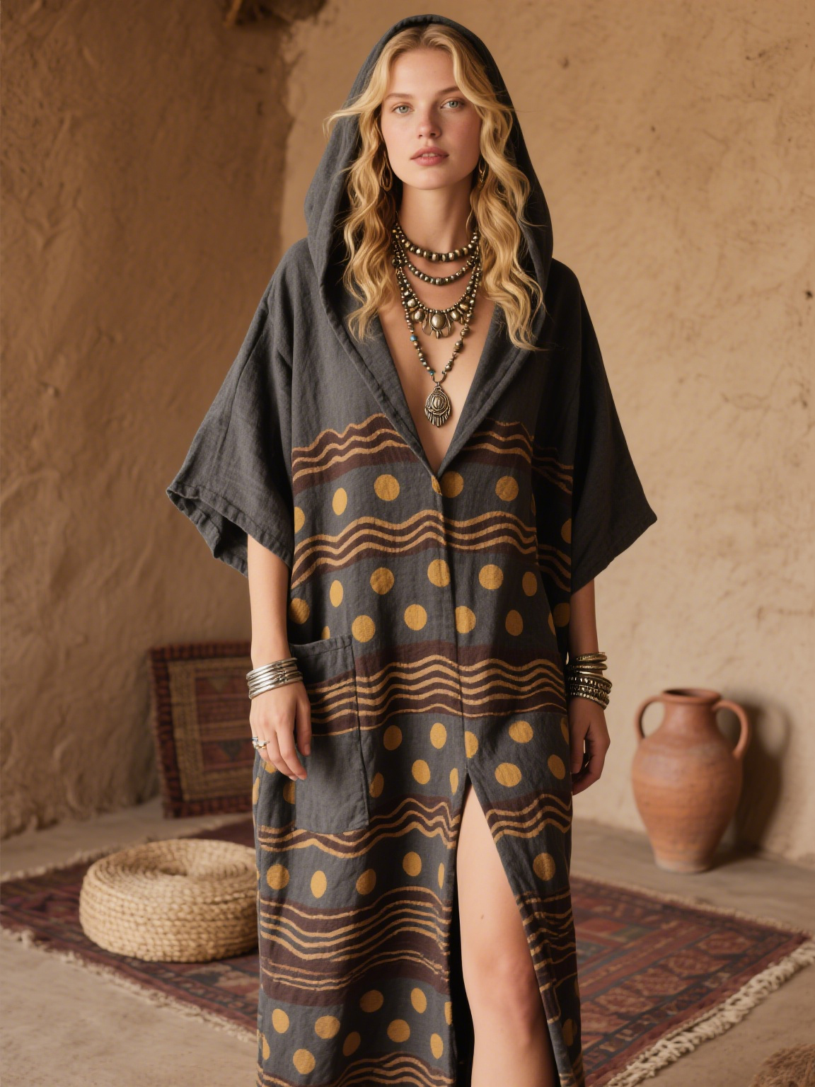 Black Polka Dots Linen Printed Kaftan Hat Style Dress