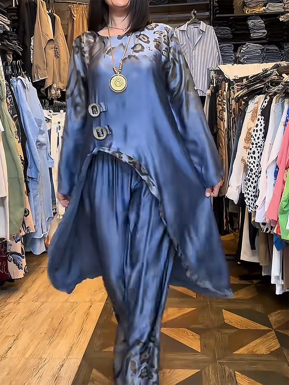 Blue of Ocean Rhythm Leopard-print Round-button Mulberry Silk Suit