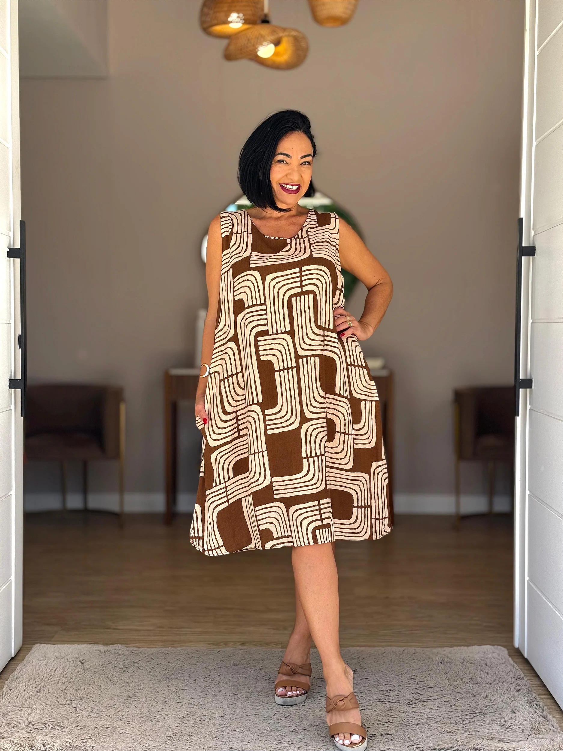 Chestnut Brown White Curved Geometric Figures Style Slim Dress