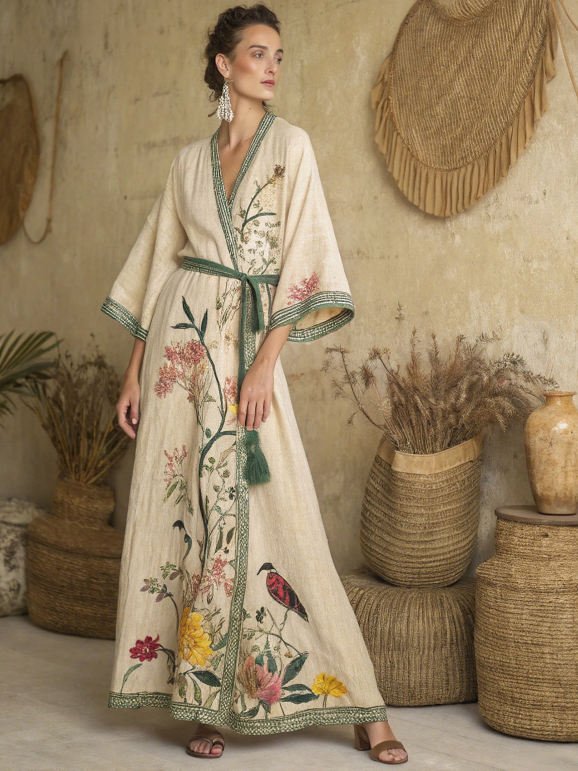 Garden Red Bird Linen Printed Kaftan Hat Style Dress
