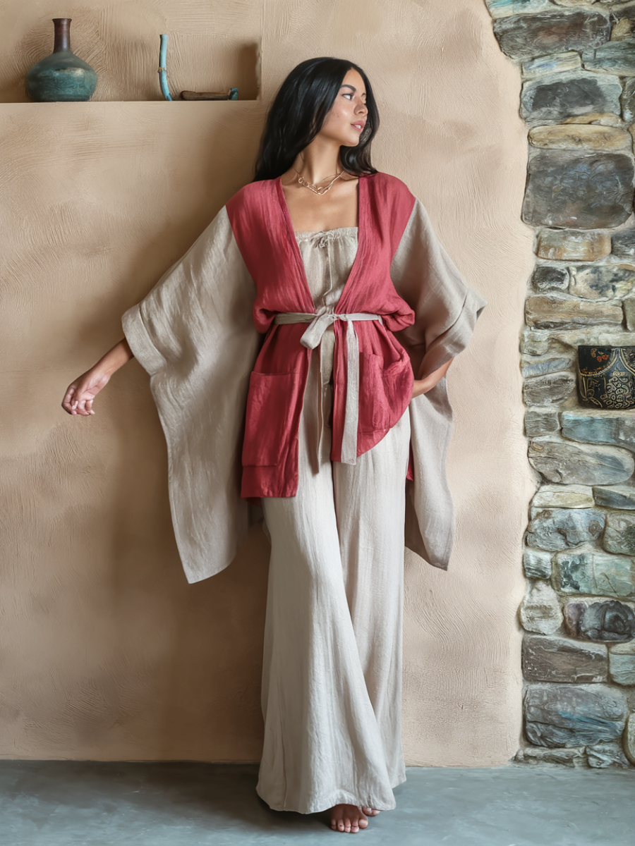 Kimono Torii Dawn Linen Tie-strap Top and trousers Two Piece Set