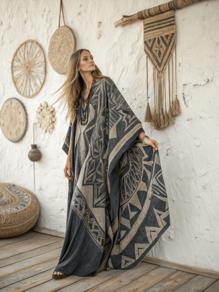 Linen Printed Kaftan Maxi Dress
