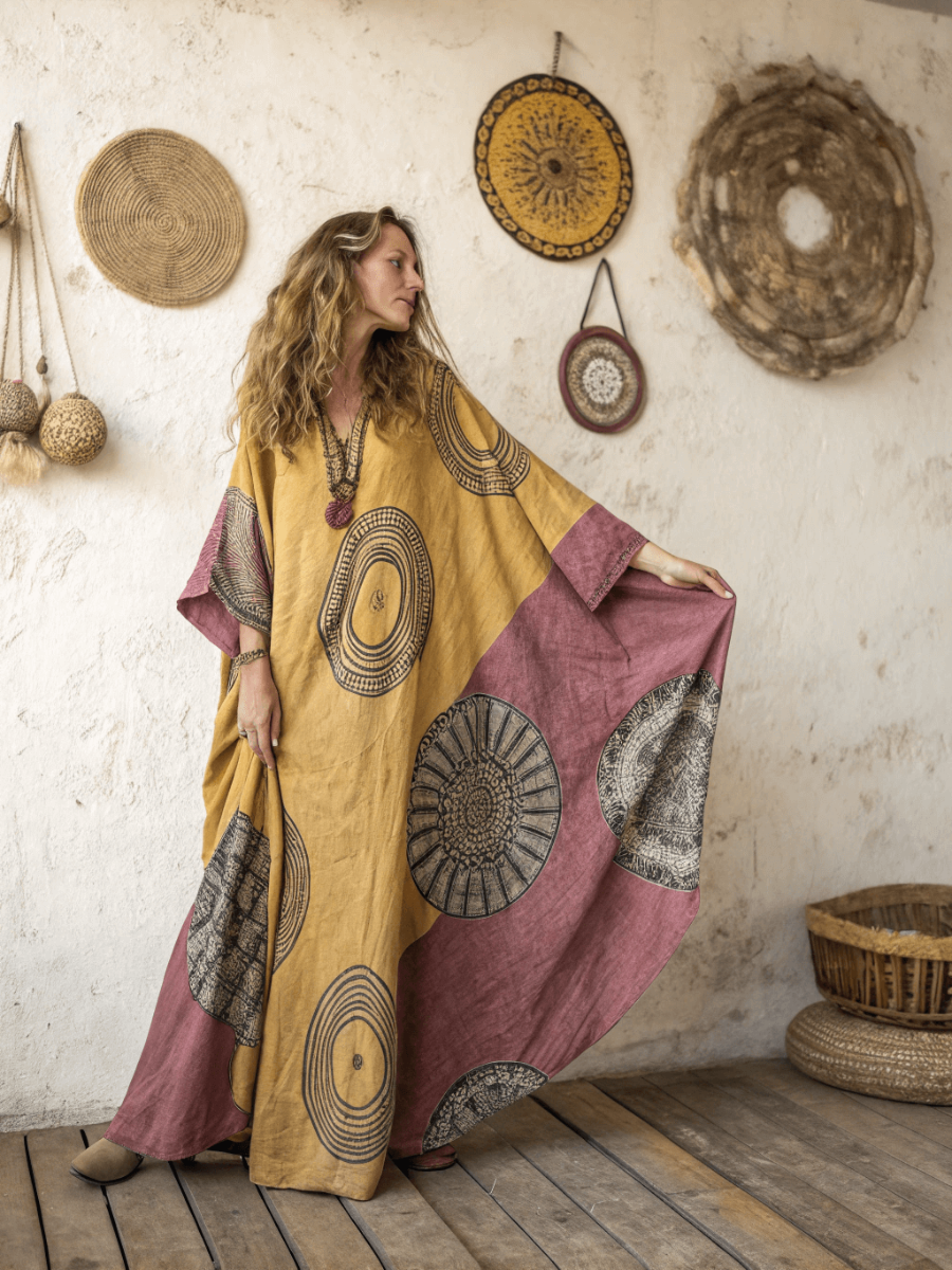 Linen Yellow Red Circle Abstract Vintage Print Kaftan Maxi Dress