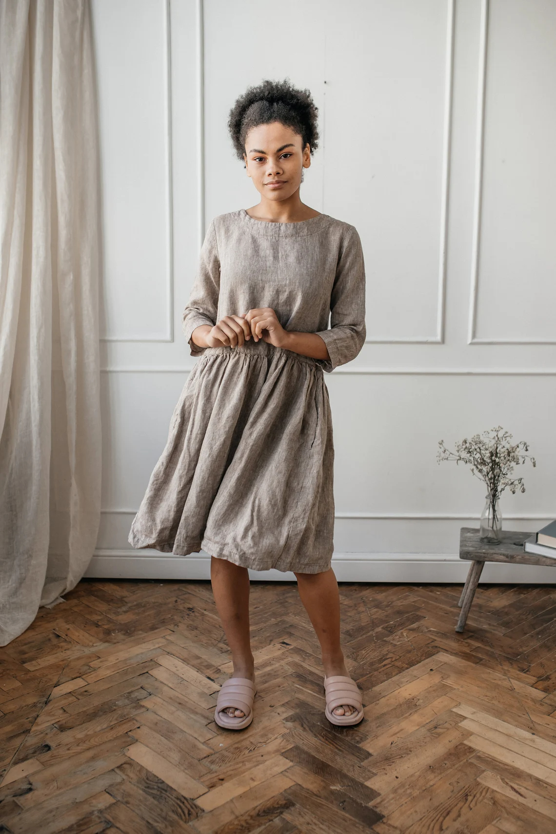 Natural Wood Gray Linen Fabric Relaxed-Fitting Dress