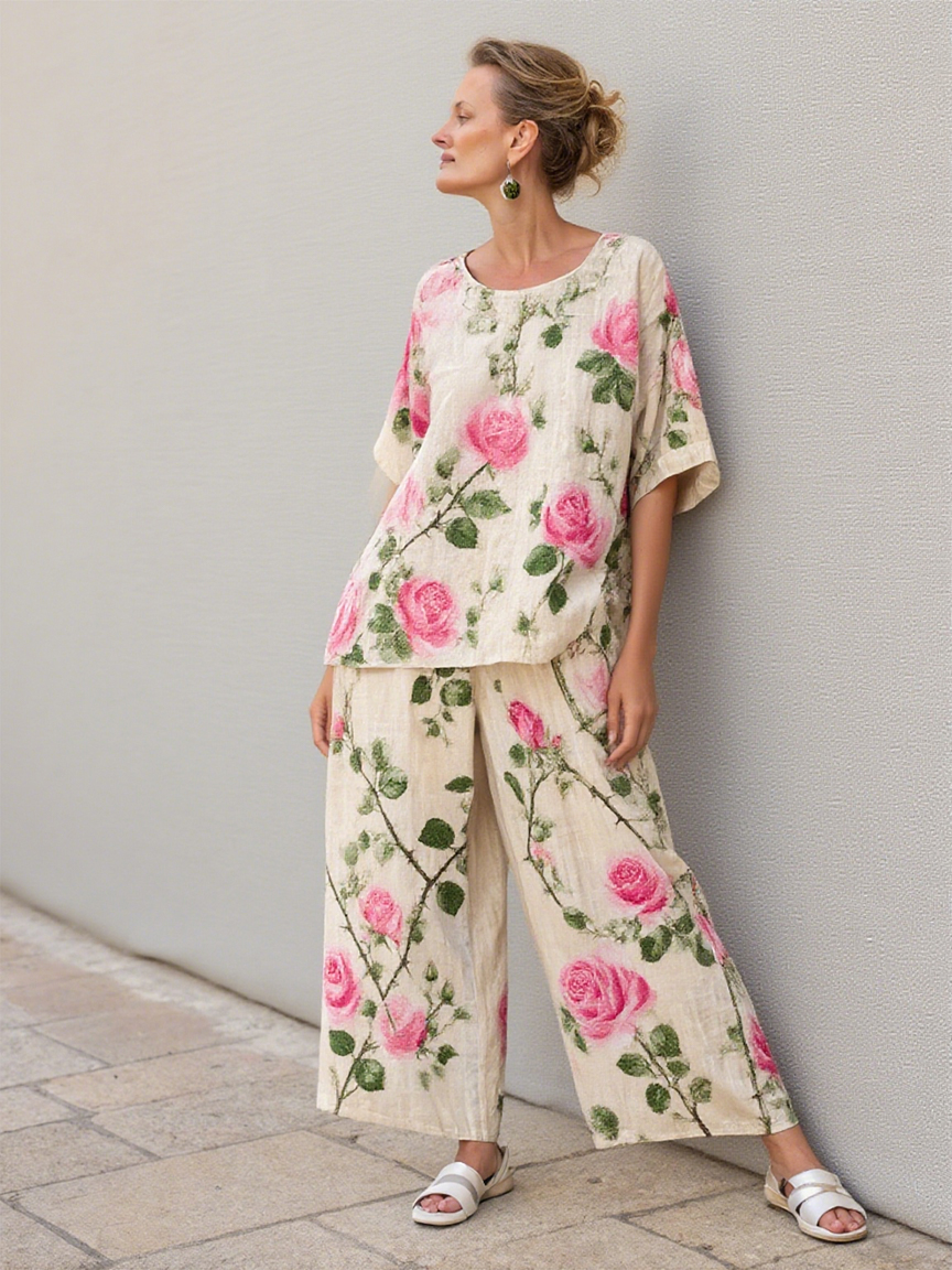 Pink Climbing Roses Cotton Linen Women's Loose Suit