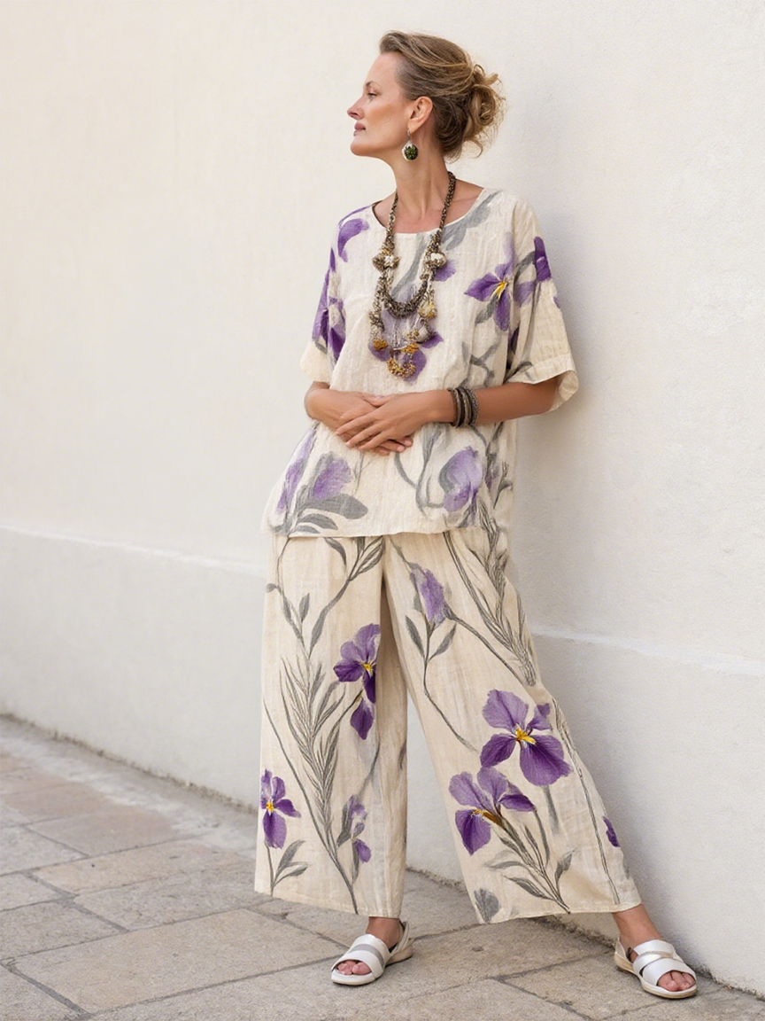 Purple Mysterious Flower Cotton Linen Women's Loose Suit