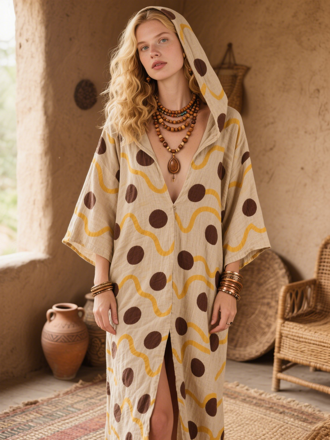 Red Circle Yellow Wave Linen Printed Kaftan Hat Style Dress