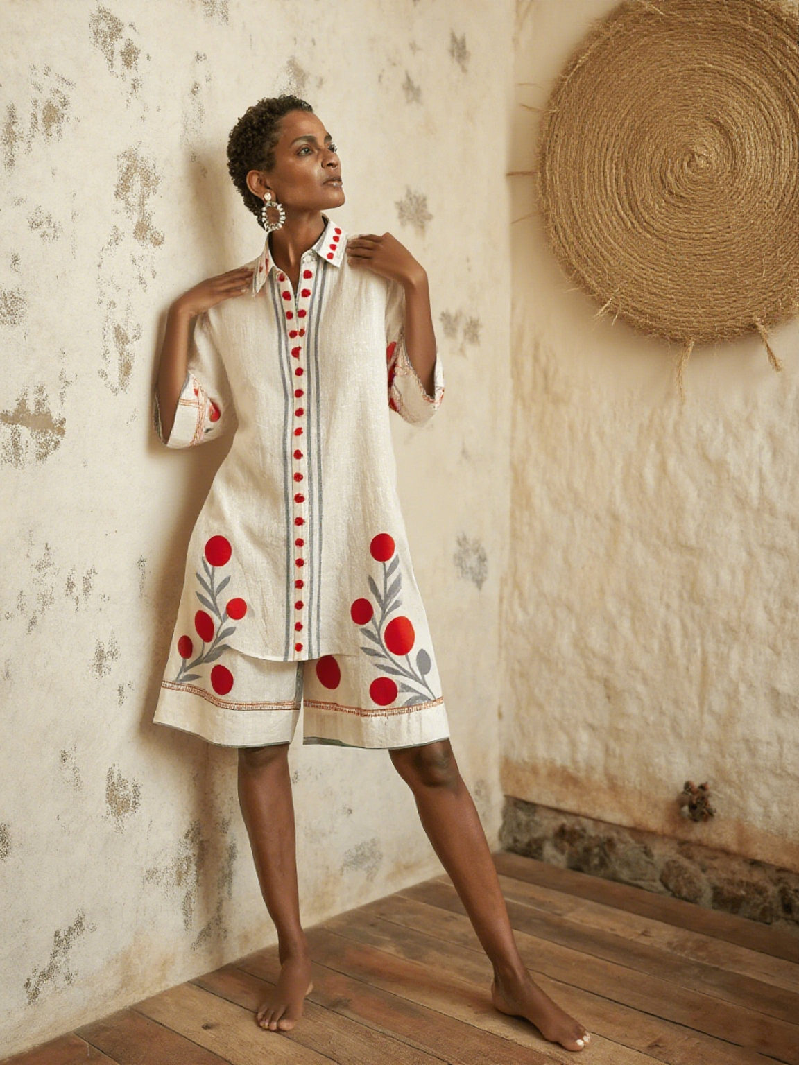 Red Circular Flower Cotton Linen Women's Shirt Set