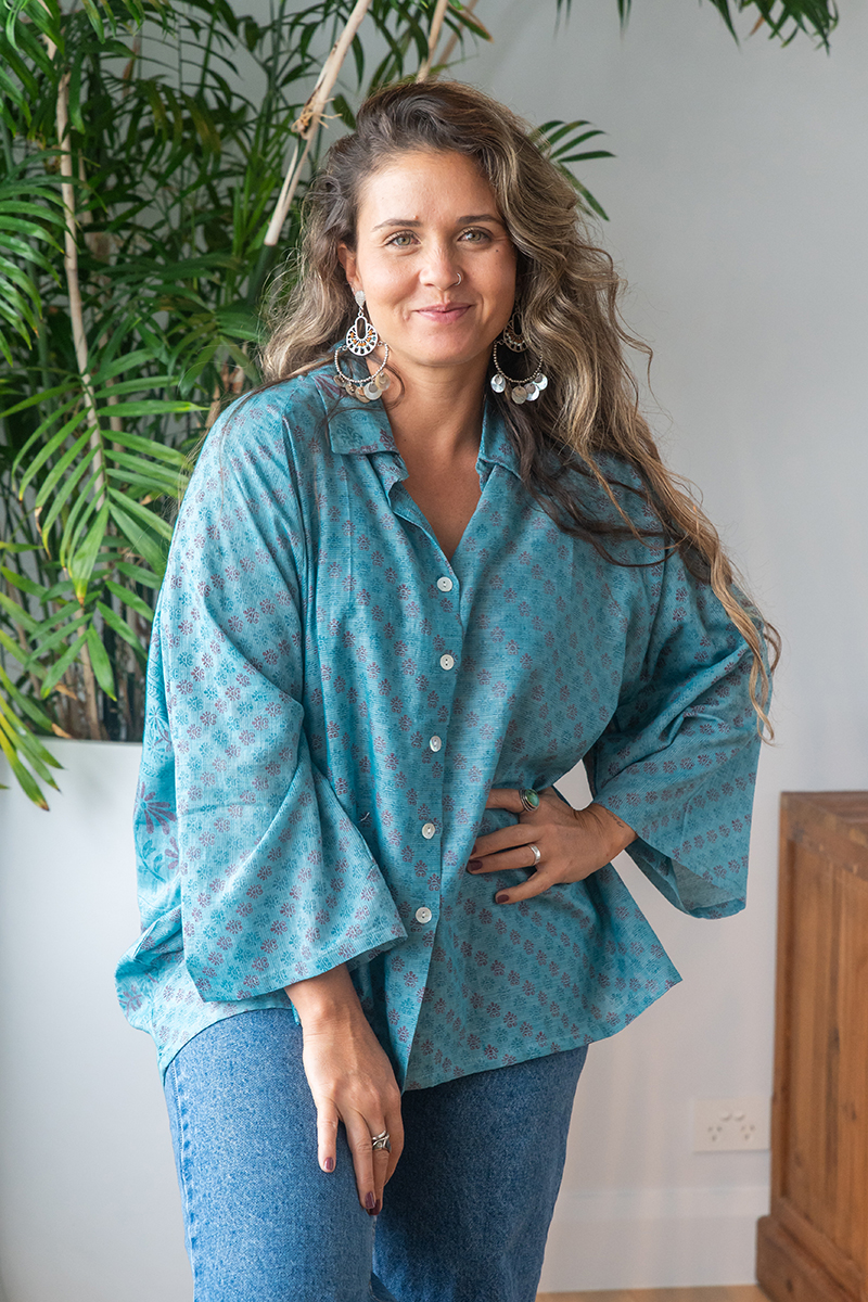 Retro Sea Blue Blossom Bouquet Motif Jacket Shirt