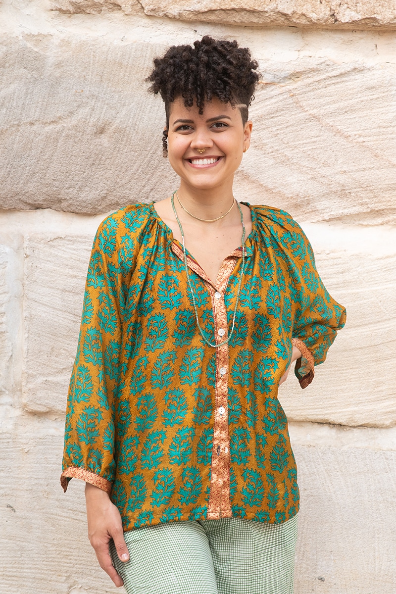 Retro Yellow Green Fern Leaf Motif Floaty Shirt