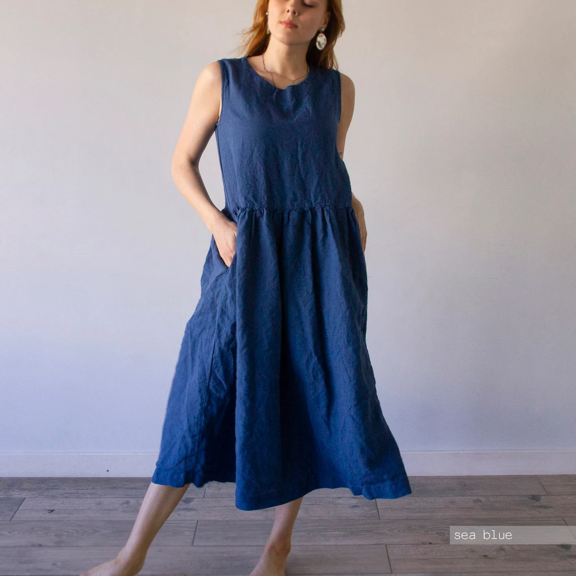 Sea Blue Linen Fabric Relaxed-Fitting Dress