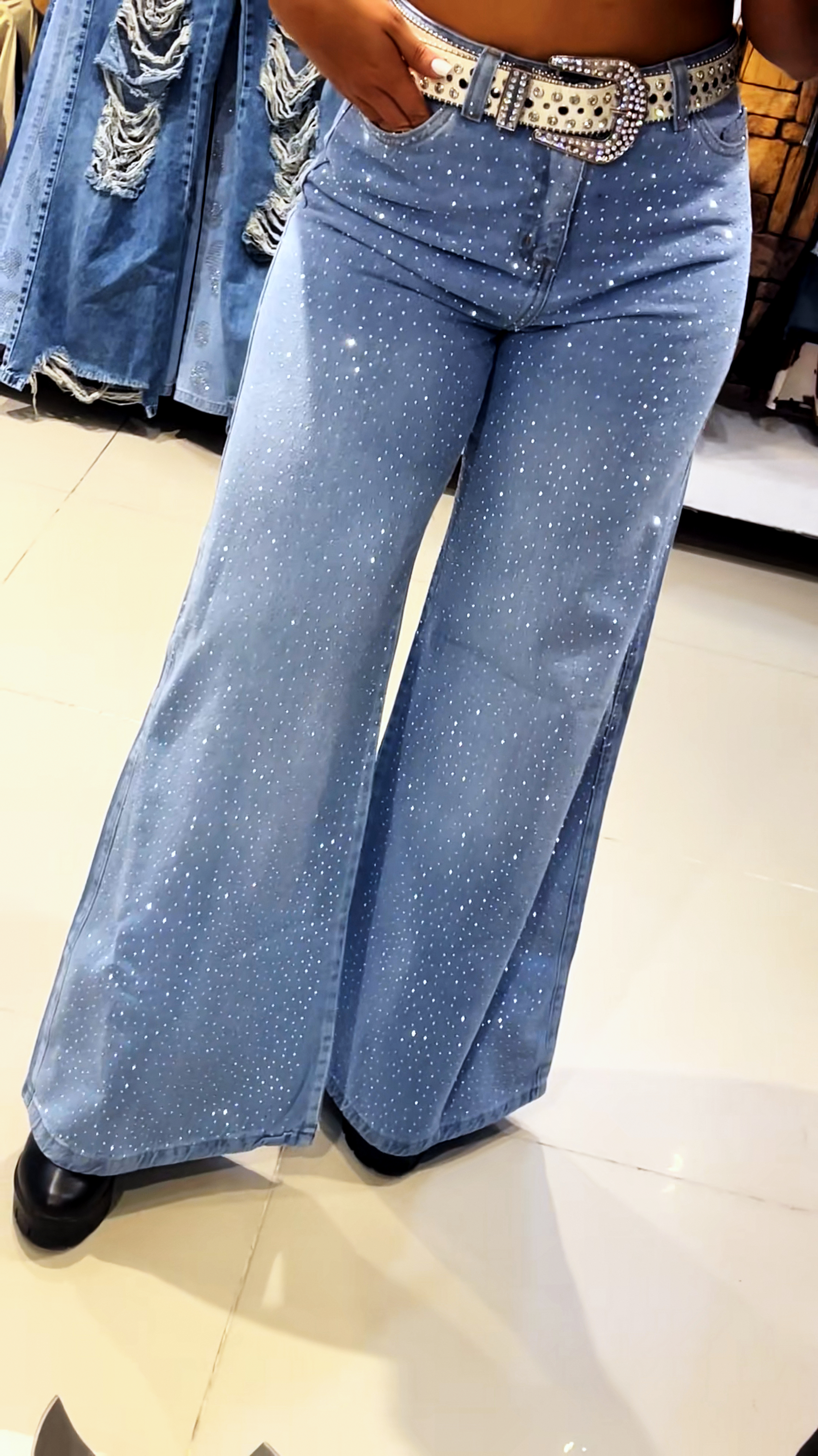 Classic denim meets dazzling zirconia. Crafted from premium denim fabric, this piece undergoes a wash process to achieve a soft blue hue. Hand-embellished with zirconia, it blends the romantic allure of the galaxy with the timeless essence of classic blue, creating a versatile wardrobe staple that seamlessly merges retro relaxation with avant-garde fashion. From everyday outings to trendy parties, it serves as both an ‘invisible contouring expert’ for leg lines and a ‘mood-setting machine’ for styling, redefining denim's fashion expression across diverse settings.