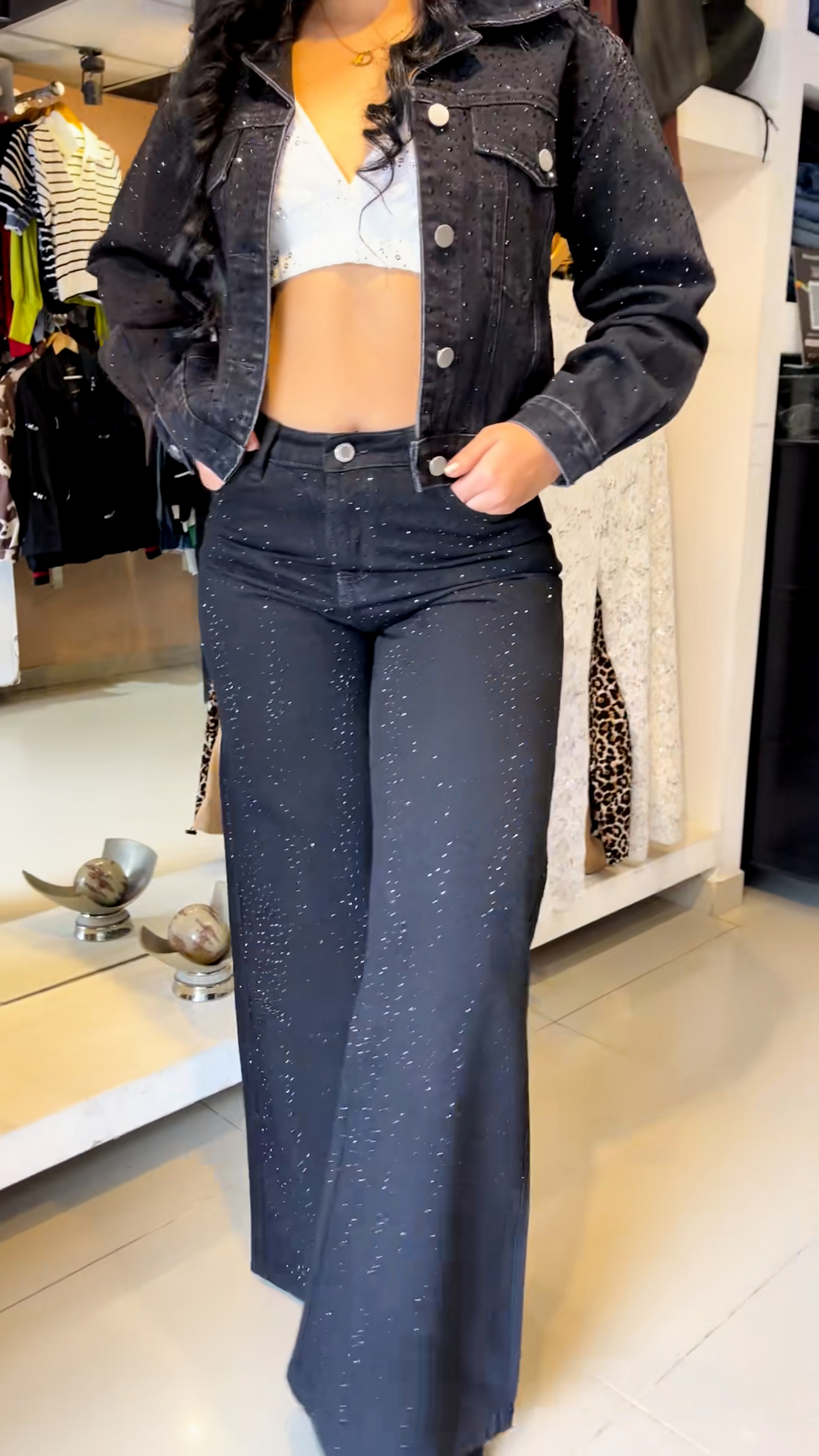 Classic denim meets dazzling zirconia. Crafted from premium denim fabric, this piece undergoes a wash process to achieve a soft blue hue. Hand-embellished with zirconia, it blends the romantic allure of the galaxy with the timeless essence of classic blue, creating a versatile wardrobe staple that seamlessly merges retro relaxation with avant-garde fashion. From everyday outings to trendy parties, it serves as both an ‘invisible contouring expert’ for leg lines and a ‘mood-setting machine’ for styling, redefining denim's fashion expression across diverse settings.