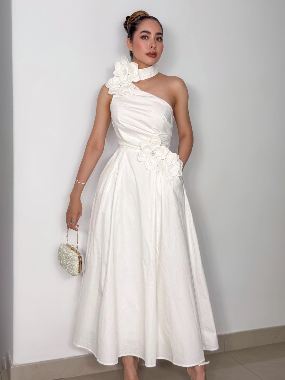 Inspired by the graceful dance of flowers in a sunny garden, this dress is more than just an ordinary gown; it's a celebration of femininity. Its open back, midi-length bodice, and flowing train create an elegant, refined silhouette. Embellished with floral embroidery, it's effortlessly effortless whether you're attending a gala or a garden party!