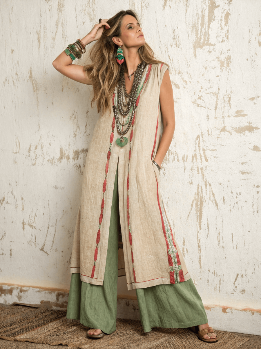 Women's cotton and linen long vest suit