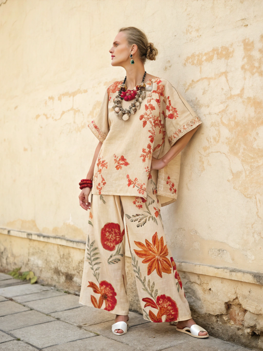 Women's holiday flower cotton and linen suit