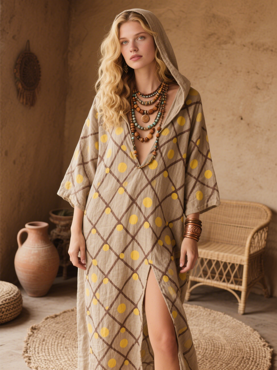 Yellow Circle Checkered Linen Printed Kaftan Hat Style Dress