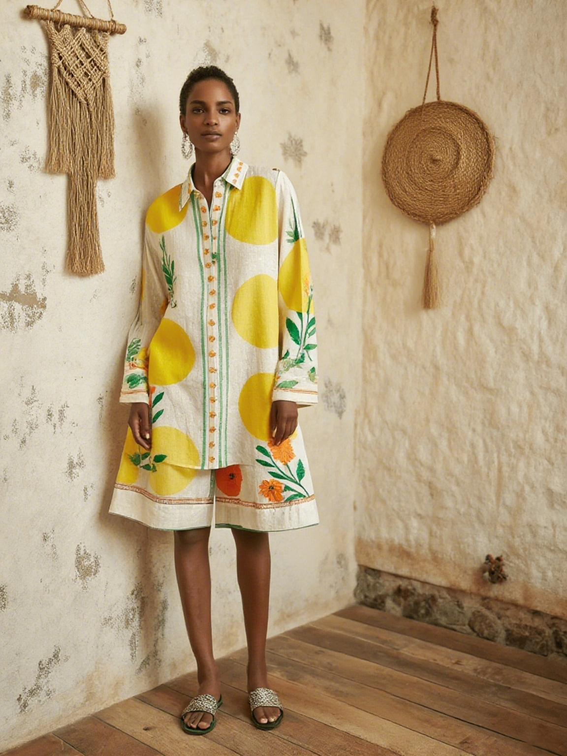 Yellow Circle Hollyhock Cotton Linen Women's Shirt Set