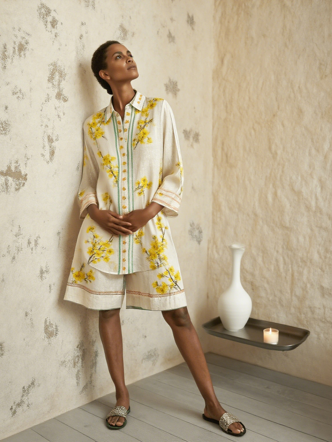 Yellow Plum Blossoms Cotton Linen Women's Shirt Set