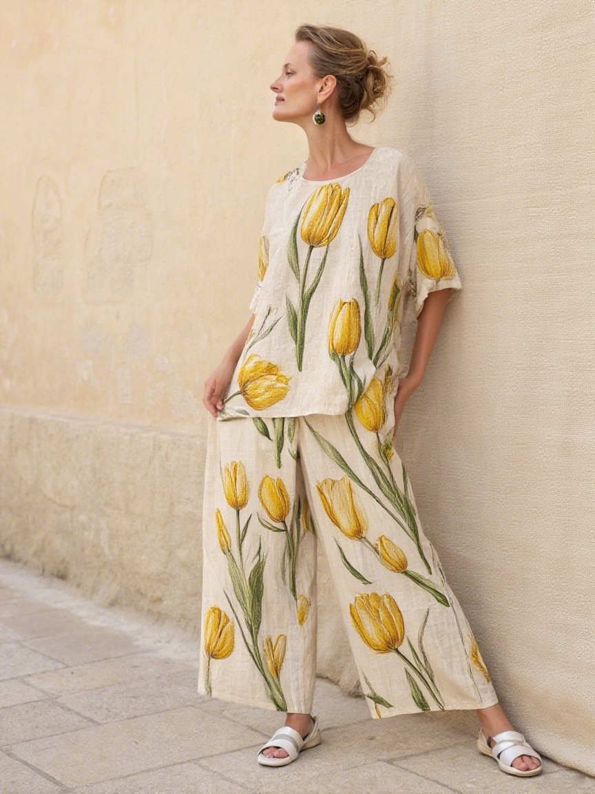 Yellow Tulips Cotton Linen Women's Loose Suit